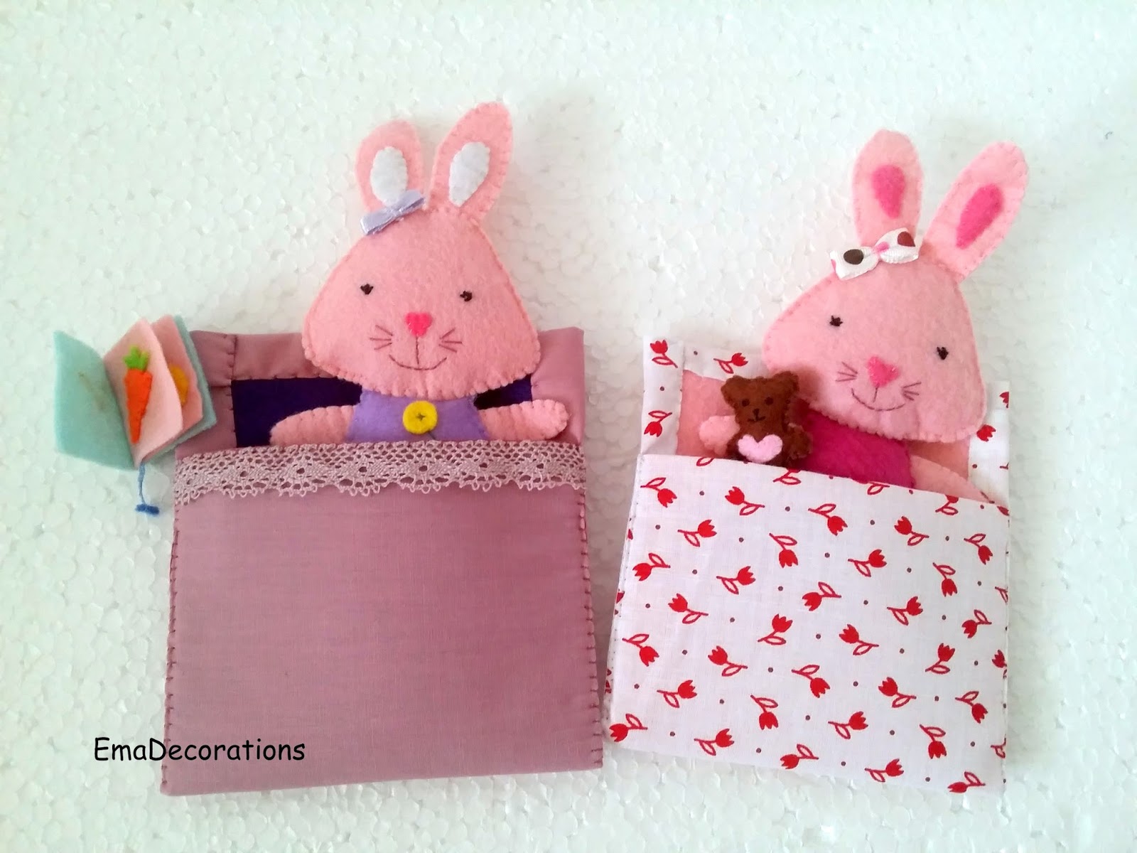 They are made from acrylic felt and their beds are made of felt and fabric. The size for the bunnies is 7.87 inches (20cm). You can buy them in My Etsy Shop.